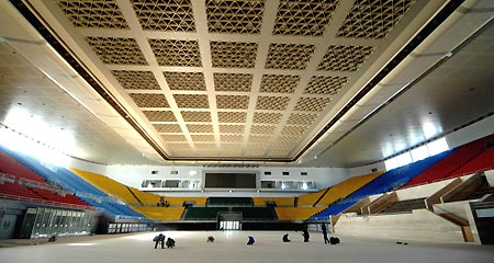 Workers maintain the wooden floor at the Capital Indoor Stadium on November 29, 2007. [Xinhua]
