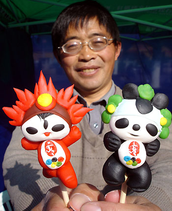 Folk artist Lu Shuhua works on a flour miniature in the shape of the mascots of the 2008 Olympic Games. [newsphoto]