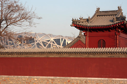 A photo taken on December 4 shows a temple and the National Stadium next to it inside the Olympic Green in Beijing. [newsphoto]