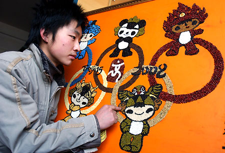 Luo Qiang, a university student from Lanzhou of Northwest China's Gansu Province, adds the finishing touches to his creations of the five Fuwa figures, the mascot for the 2008 Beijing Olympics, January 4, 2008. Luo used a variety of grains and beans to create the images. [Xinhua]