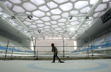 Workers clean the floor inside the National Aquatics Centre, also known as the Water Cube, in Beijing January 7, 2008. The venue, built for the Beijing Olympics, will host its first event - the "Good Luck Beijing" Swimming China Open - from January 31 to February 5. [Xinhua] |