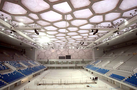 Workers add the finishing touches to the National Aquatics Centre, also known as the Water Cube, in Beijing January 7, 2008. The venue, built for the Beijing Olympics, will host its first event - the "Good Luck Beijing" Swimming China Open - from January 31 to February 5. [Xinhua]