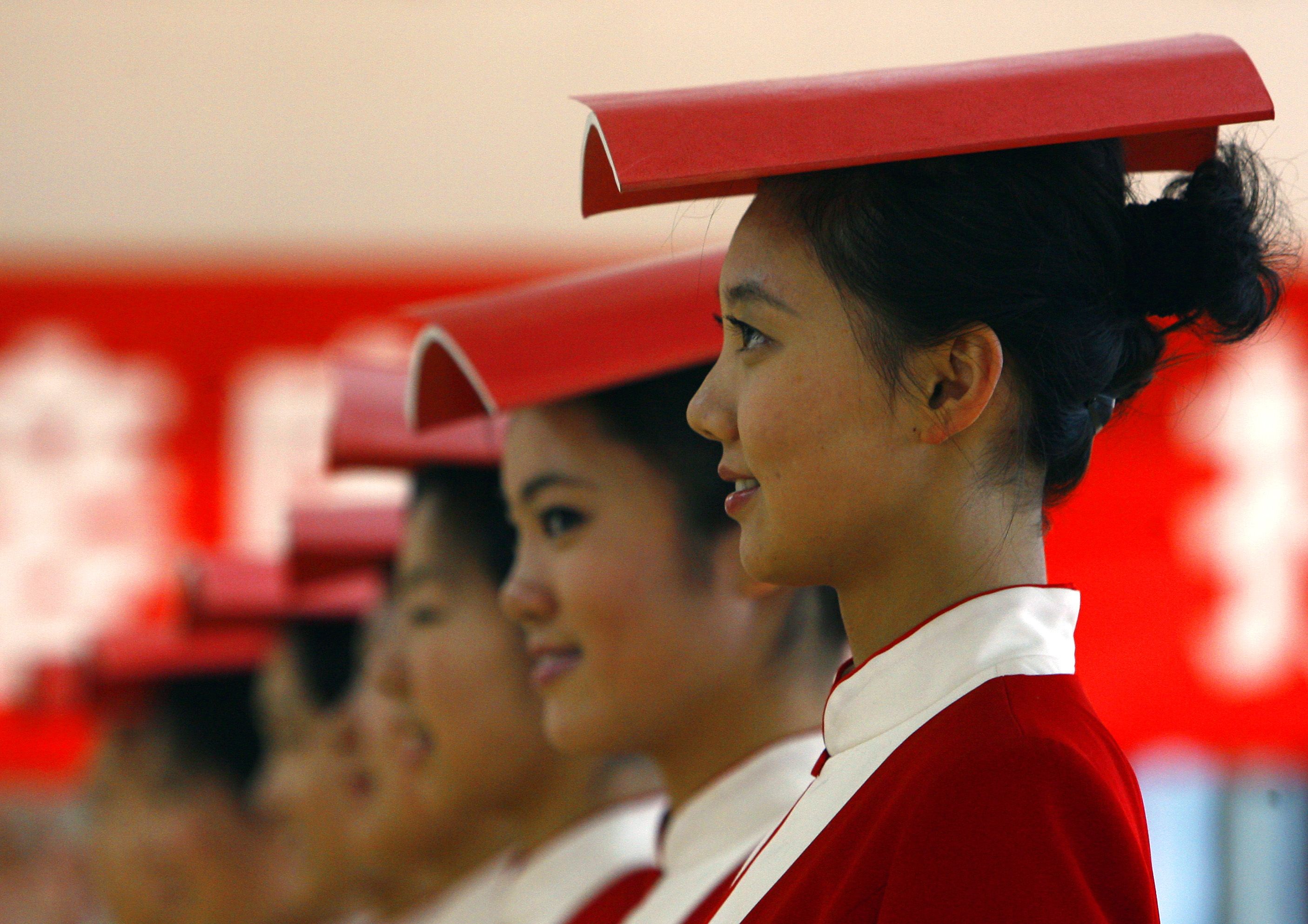 Students balance books on their heads during an etiquette training class at a vocational school in Beijing January 7, 2008. [Agencies] |