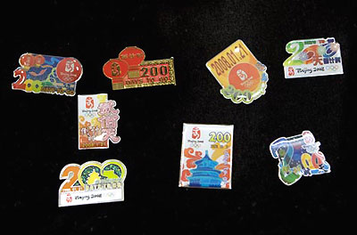 Commemorative pins are on display at the Beijing International Conference Center, Jan. 8, 2008. More than 1,000 kinds of new souvenirs will hit the market in light of the 200-day countdown to the Olympic Games, and of course, the fast approaching Spring Festival holiday. [BOCOG]