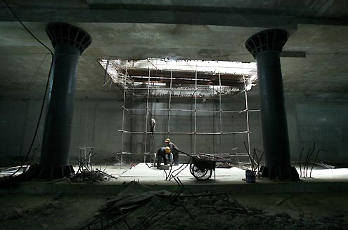 Workers prepare to hoist equipment in one of the railway tunnels under construction in central Beijing January 10, 2008. Three new subway lines are scheduled to be in operation by the end of July as part of the preparations for the Beijing Olympics, with organisers leaving nothing to chance for China's "coming-out party" this year ahead of the opening ceremony on August 8. The last Olympics in Athens were beset by last-minute construction problems, but with seven months to go before the start, the city is primed for the world's biggest sporting event. [Agencies]