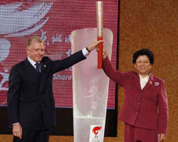 IOC Coordination Commission Chairman Hein Verbruggen (L) and Chinese State Councilor Chen Zhili hold the Beijing Olympic torch in this April 26, 2007 file photo. The Olympic torch relay will make an appearance in Tiananmen Square on the eve of the Summer Games, local media revealed Thursday. [Agencies] |