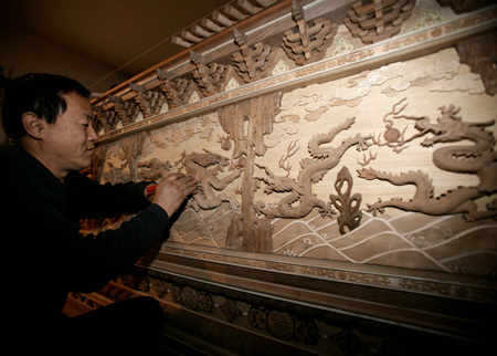 Artist Kang Yinzhong carves a wooden screen at a workshop in Sanquan village in Yuanping, North China's Shanxi Province, January 10, 2008. Eight craftsmen in the village are working on a giant wooden screen featuring 2,008 dragons as a gift for this year's Beijing Olympic Games. [Xinhua]