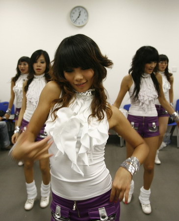 Members of the "Soojin Dance" cheerleaders' squad practise a dance before a performance during the Good Luck Beijing 2008 Handball Tournament at the National Indoor Stadium in Beijing January 11, 2008. [Agencies]