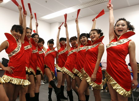 Members of the "Soojin Dance" cheerleaders' squad, dressed in Chinese traditional costumes, practise a dance before a performance during the Good Luck Beijing 2008 Handball Tournament at the National Indoor Stadium in Beijing January 11, 2008. [Agencies]