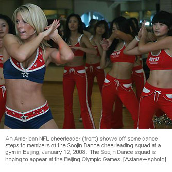 An American National Football League (NFL) cheerleader (L) gives a dance lesson to members of the Soojin Dance cheerleading squad at a gym in Beijing, January 12, 2008. The Soojin Dance cheerleading squad, which has performed at a few "Good Luck Beijing" pre-Olympic events, is hoping to appear at the upcoming Beijing Olympic Games. [Asianewsphoto]