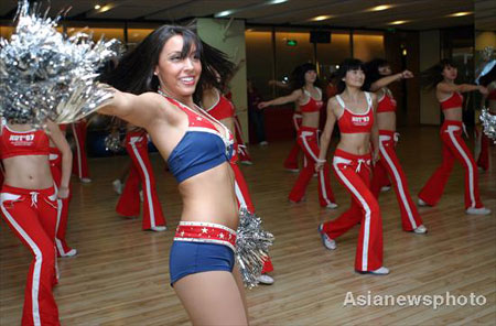 An American National Football League (NFL) cheerleader (front) gives a dance class to members of the Soojin Dance cheerleading squad at a gym in Beijing, January 12, 2008. The Soojin Dance cheerleading squad, which has performed at a few "Good Luck Beijing" pre-Olympic events, is hoping to appear at the upcoming Beijing Olympic Games. [Asianewsphoto]