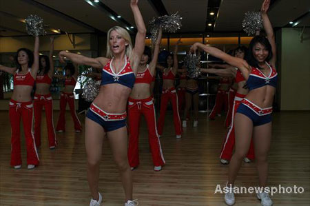 American National Football League (NFL) cheerleaders (front) shows off dance steps to members of the Soojin Dance cheerleading squad at a gym in Beijing, January 12, 2008. The Soojin Dance cheerleading squad, which has performed at a few "Good Luck Beijing" pre-Olympic events, is hoping to appear at the upcoming Beijing Olympic Games. [Asianewsphoto]