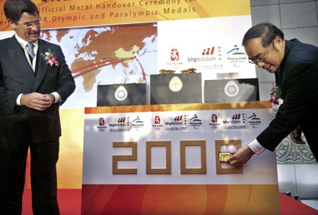 The BHP Billiton China President, Clinton Dines (L) looks on as BOCOG official Zhao Dongming puts a gold bar on a banner during a handover ceremony in Shanghai January 15, 2008.The gold bars were handed over by BHP Billiton to a mint factory for the manufacture of gold medals in the upcoming Olympic Games in Beijing. [Agencies]