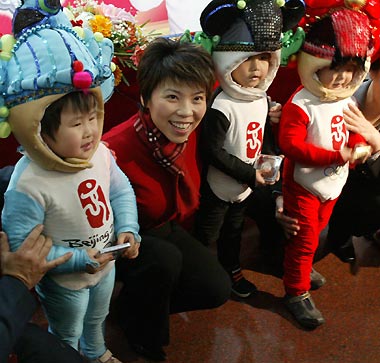 Former Olympic table tennis champion Deng Yaping poses with children at a commercial ceremony in Beijing on December 15, 2008 [Xinhua]
