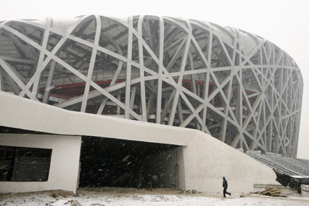 A worker walks in the snow toward the construction site of the National Stadium, also known as the Bird's Nest, in Beijing January 17, 2008. [Agencies]