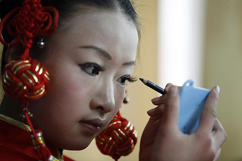 A member of the Beijing Xueming Art Group prepares her make-up ahead of the opening ceremony of the Daxing Farmers Arts Festival on the outskirts of Beijing January 17, 2008. The festival is a part of activities to celebrate the upcoming 200-day countdown to the Beijing Olympic Games. Walking and performing on stilts is one of the most famous traditional Chinese arts and this group has members between 13 and 26 years old, who began to take up stilt performance since 2005. [Agencies]