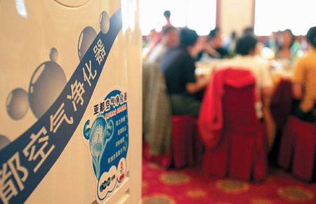 An air purifier at Quanjude Roast Duck Restaurant in Hepingmen helps dissipate the smell of  nocotine. [China Daily]