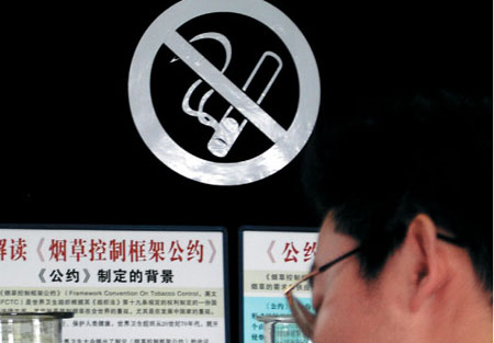 A bypasser reads the Framework Convention on Tobacco Control in an exhibition in Yichang, Hubei Province. [China Daily]
