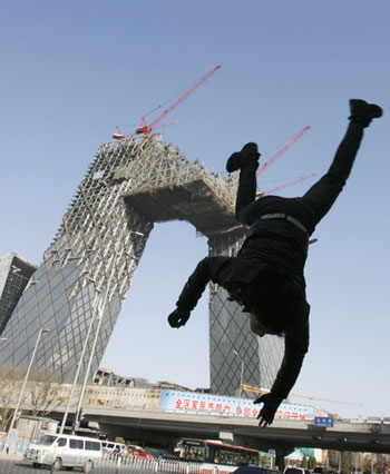 Du Yize, the founder and trainer of the Beijing Du Yize Parkour Club, shows his skills outside the CCTV Tower in Beijing January 23, 2008. Parkour, "the art of moving", which involves moving from one point to another as efficiently and quickly as possible and overcoming obstacles using mainly the abilities of the human body, is practised in urban settings worldwide. [Agencies]