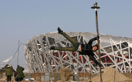 Du Yize, the founder and trainer of the Beijing Du Yize Parkour Club, shows his skills in front of the Olympic Stadium in Beijing January 23, 2008. Parkour, "the art of moving", which involves moving from one point to another as efficiently and quickly as possible and overcoming obstacles using mainly the abilities of the human body, is practised in urban settings worldwide. [Agencies]