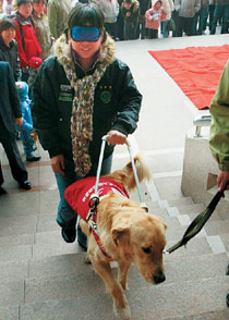 | Dalian Guide Dog Training Base staff demonstrate the use of guide dogs in the city's downtown in December. [China Daily] |