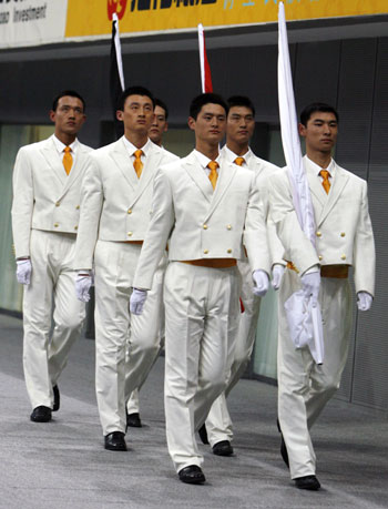 Chinese honour guards of the People's Liberation Army march before the award ceremony of the Good Luck Beijing Wheelchair Basketball International Invitational Tournament at the National Indoor Stadium in Beijing January 25, 2008. Canadian wheelchair basketball players won double gold in the Good Luck Beijing Wheelchair Basketball International Invitational Tournament. [Agencies]