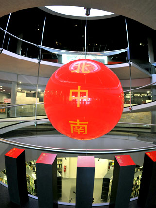 A big balloon hanging on the museum's ceiling carries five Chinese characters which read east, west, south, north and center. [IOC]