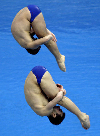 Athen's Olympic champion Thomas Bimis and Alexandros Manos of Greece compete in the preliminary round of the three-metre synchronised springboard during the Good Luck Beijing FINA World Cup diving competition at the National Aquatics Centre in Beijing February 19, 2008. Thomas Bimis failed to make the final as well as the Beijing Olympics. [Agencies] |
