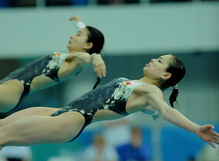 China's Olympic champions Wu Minxia (near the camera) and Guo Jingjing dive during the women's three-meter springboard synchronized preliminary at the "Good Luck Beijing" FINA Diving World Cup on Sunday. [Xinhua]
