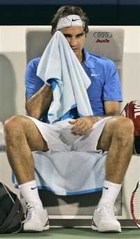 Roger Federer of Switzerland dries his face during the last break before being defeated by Andy Murray from Great Britain 6-7, 6-3, 6-4 during the 1st round of Dubai Tennis Championship in Dubai, Monday, March 3, 2008. Federer has cast doubt on whether he will stay in the Olympic village in August. [Agencies]