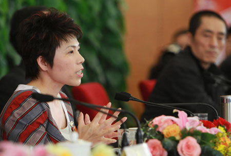 Deng Yaping (L), former table tennis Olympic champion and deputy director of the Olympic Village of BOCOG, attends a press conference on the sidelines of the annual session of the top political advisory body at the Great Hall of the People in Beijing, March 12, 2008. [Xinhua]