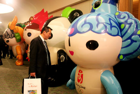 AA visitor looks at the Fuwa, the mascots for the Beijing Olympic Games, as part of of the promotional event "Visit China in Olympic Year", in Tokyo, Japan, March 17, 2008. Some 300 Japanese attend the event. [Xinhua]