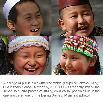 Yang Ke, a girl from the Tibetan ethnic group, smiles as she plays with other pupils at Lanzhou Qing Hua Primary School, in Lanzhou, capital of Northwest China's Gansu Province, March 15, 2008. The Beijing Organizing Committee for the Olympic Games (BOCOG) recently invited the school, which is known for having students from many ethnic groups, to submit photographs of smiling children for possible use in the August 8 Opening Ceremony of the Beijing Olympic Games. BOCOG started collecting photographs of children's smiling faces from around the world on Sept 4 last year. [Asianewsphoto] Related Reading