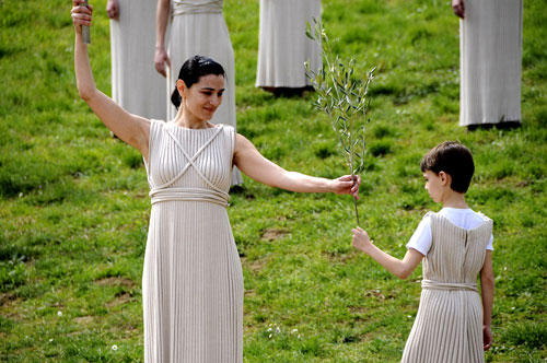 Maria Nafpliotou (L), the High Priestess of the Flame-lighting Ceremony in Ancient Olympia and a Greek boy perform at a rehearsal before the Lighting Ceremony for the Beijing Olympic Games in ancient Olympia, Greece March 22, 2008. The ceremony will be officially held at 11 o' clock a.m. on Monday local time. [Xinhua]