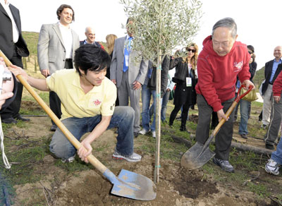 Chinese pop singer Wang Lihong (L) and Liu Hongliang plant a tree in the Coubertin Grove, where modern Games founding father Pierre de Coubertin is buried, in Ancient Olympia, Greece, March 23, 2008. Wang and Liu will be torchbearers in the Greek ralay of the 2008 Beijing Olympic flame. [Xinhua]