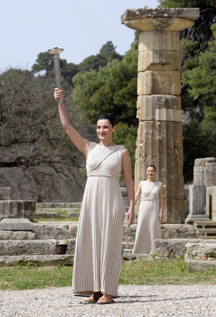 Maria Nafpliotou (front), the High Priestess holds the Olympic flame at the Lighting Ceremony for the Beijing Olympic Games in ancient Olympia, Greece March 24, 2008. [Xinhua]