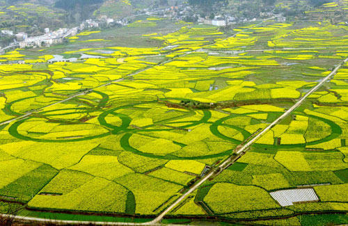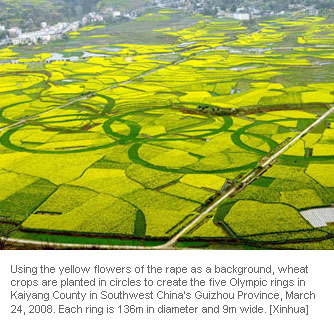 Using the yellow flowers of rape as a background, wheat crops are planted in circles to create the five Olympic rings in Kaiyang County in Southwest China's Guizhou Province, March 24, 2008. Each ring is 136m in diameter and 9m wide. [Xinhua]