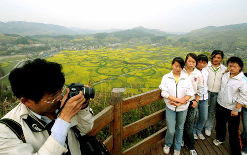 Tourists have their photos taken in front of a rape and wheat crop in Kaiyang County of Southwest China's Guizhou Province March 24, 2008. [Xinhua]