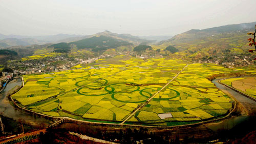 Using the yellow flowers of rape a background, wheat crops are planted in circles to create the five Olympic rings in Kaiyang County in Southwest China's Guizhou Province, March 24, 2008. Each ring is 136m in diameter and 9m wide. [Xinhua]
