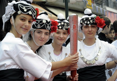 Girls in ethnic costume take a photo with an Olympic torch in Giannitsa of Greece March 27, 2008. The Olympic flame travelled in six cities in north Greece in its fourth day relay. [Xinhua] Photos