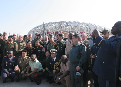 Military attaches pose yesterday in front of the National Stadium, the "Bird's Nest", which will host the opening and closing ceremonies of this summer's Olympics. More than 90 envoys from 60 countries attended the event. [China Daily]