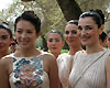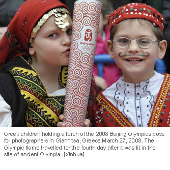 Girls in ethnic costume take a photo with an Olympic torch in Giannitsa of Greece March 27, 2008. The Olympic flame travelled in six cities in north Greece in its fourth day relay. [Xinhua]