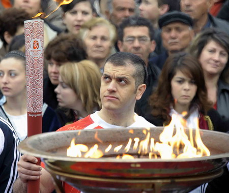 A torchbearer stands by a cauldron with a torch in his hand in Skidra of Greece March 27, 2008. The Olympic flame travelled in six cities in north Greece in its fourth day relay. [Xinhua]
