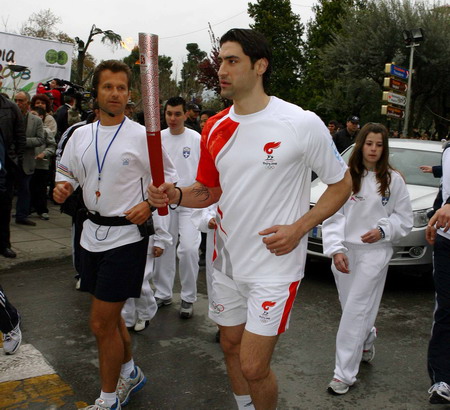 A torchbearer marches in Veria City of Greece March 27, 2008. The Olympic flame travelled in six cities in north Greece in its fourth day relay. [Xinhua]