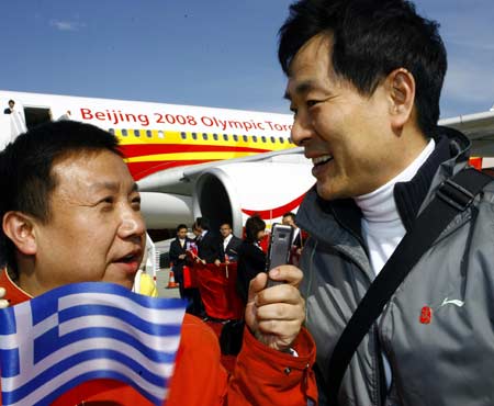 Chinese actor Pu Cunxin (R), a delegate who will take part in the ceremony for handing over of the Olympic flame this Sunday, is interviewed by a journalist after the plane for Beijing 2008 Olympic Torch Relay arrives in Athens of Greece on March 29, 2008. [Xinhua]