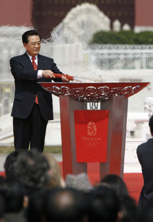 Chinese President Hu Jintao lights a cauldron with the Olympic Torch during the "Welcome Ceremony for the Olympic Flame and the Launching Ceremony of the Beijing 2008 Olympic Torch Relay" at Tiananmen Square in Beijing, March 31, 2008. Hu officially announced the beginning of the Beijing Olympic torch relay on Monday. [Agencies] |