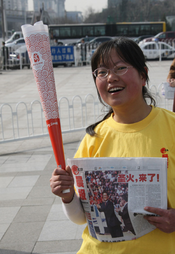 A Beijing resident holds a paper pole resembling the shape of the Olympic torch and a copy of Beijing Morning Post with the news coverage of the arrival of the flame on front page at Tiananmen Square in Beijing March 31, 2008. The flame arrived in Beijing from Athens on Monday Morning. [Xinhua]