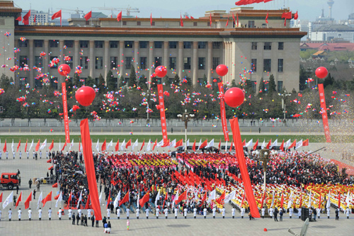 The Launching Ceremony of the 2008 Beijing Olympic Torch Relay is held at Tiananmen Square in Beijing March 31, 2008. The flame arrived in Beijing from Athens on Monday morning to kick of the world-wide torch relay. [Xinhua]