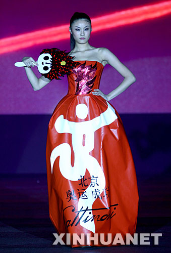 A model, holding a fan featuring Fuwa mascot Huan Huan, wears an Olympic-themed strapless gown with the logo of the Beijing Olympic Games and Chinese characters saying "Success for the Beijing Olympics" during China's International Fashion Week in Beijing, March 27, 2008. The dress was created by Italian designers. [Xinhua]