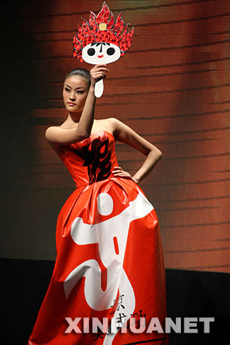 A model, holding a fan featuring Fuwa mascot Huan Huan, wears an Olympic-themed strapless gown with the logo of the Beijing Olympic Games and Chinese characters saying "Success for the Beijing Olympics" during China's International Fashion Week in Beijing, March 27, 2008. The dress was created by Italian designers. [Xinhua]